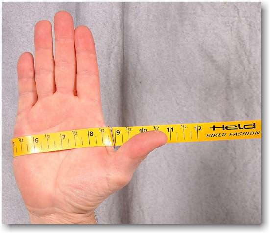 Held numerical sizing corresponds to inch measurements done as follows. Keep your hand as wide and flat as possible with the thumb sticking straight out. Wind a flexible measuring tape around the widest part of your hand, below the knuckles, not including your thumb. The photo shows an example of a size 9 hand. Never order smaller than your measured size. If between sizes choose the larger. Held gloves are cut to fit snug when new with few wrinkles and little crumpling in the palm area.